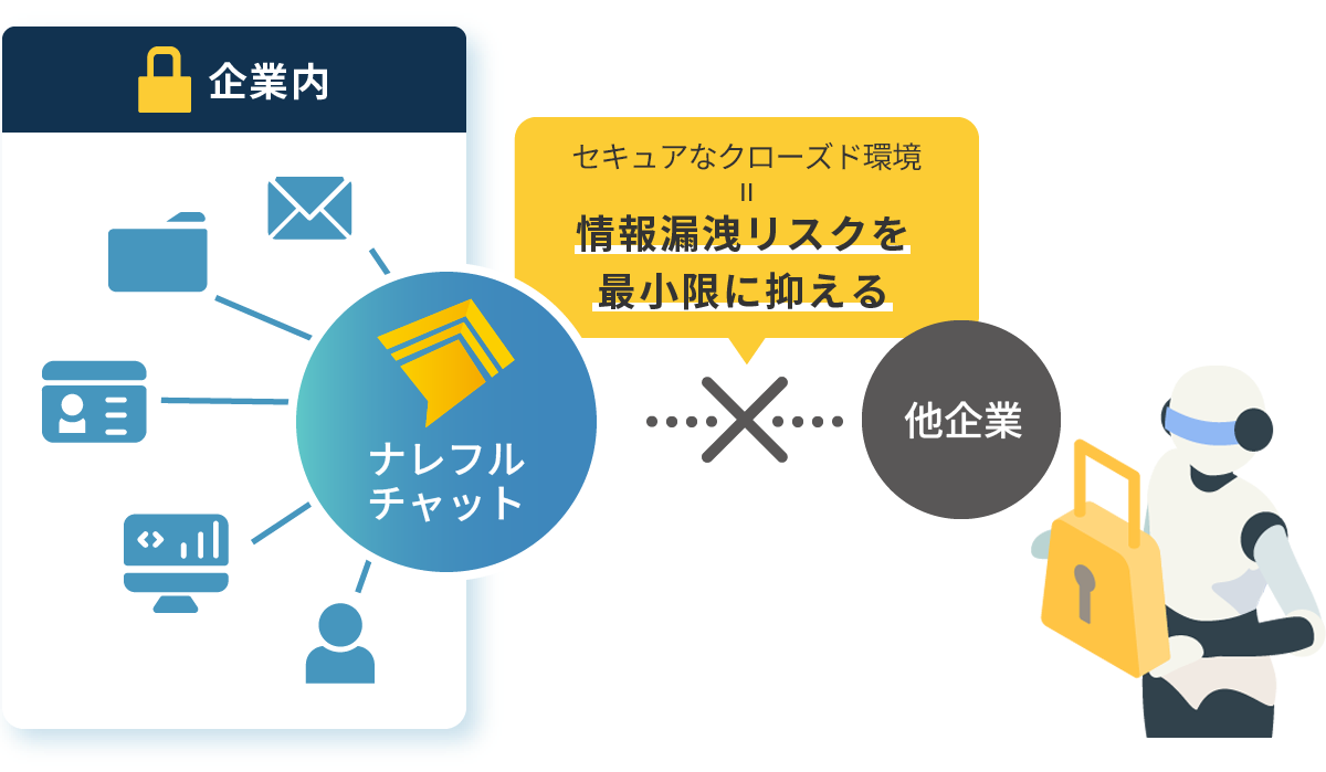 ナレフルチャットは、企業専用のクローズド環境でセキュアに利用できる対話型生成AIチャットツールです。従業員のAIリテラシー向上から、組織全体のナレッジ共有まで包括的にサポートし、企業の生成AI導入における悩みを解決いたします。
