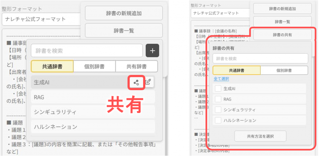 従来の辞書機能に加えて、登録した辞書を組織全体やチーム単位で共有できる機能を新たに追加しました。共有された辞書は、共有ユーザーの議事録整形時に自動的に参照され、生成AIの文字起こし時の誤変換を抑止します。