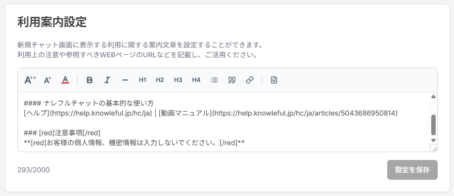 新規チャットを始める画面に表示するテキストを、自由に設定できます。生成AI初心者向けの使い方ガイド、機密情報取り扱いの注意喚起、独自の社内ルールなど、企業独自のメッセージを全従業員に確実に届け、ITリテラシーが低い社員への導入支援や社内ガバナンスの強化を実現します。