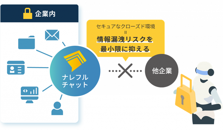 ナレフルチャットは、企業専用のクローズド環境でセキュアに利用できる対話型生成AIチャットツールです。従業員のAIリテラシー向上から、組織全体のナレッジ共有まで包括的にサポートし、企業の生成AI導入における悩みを解決いたします。
