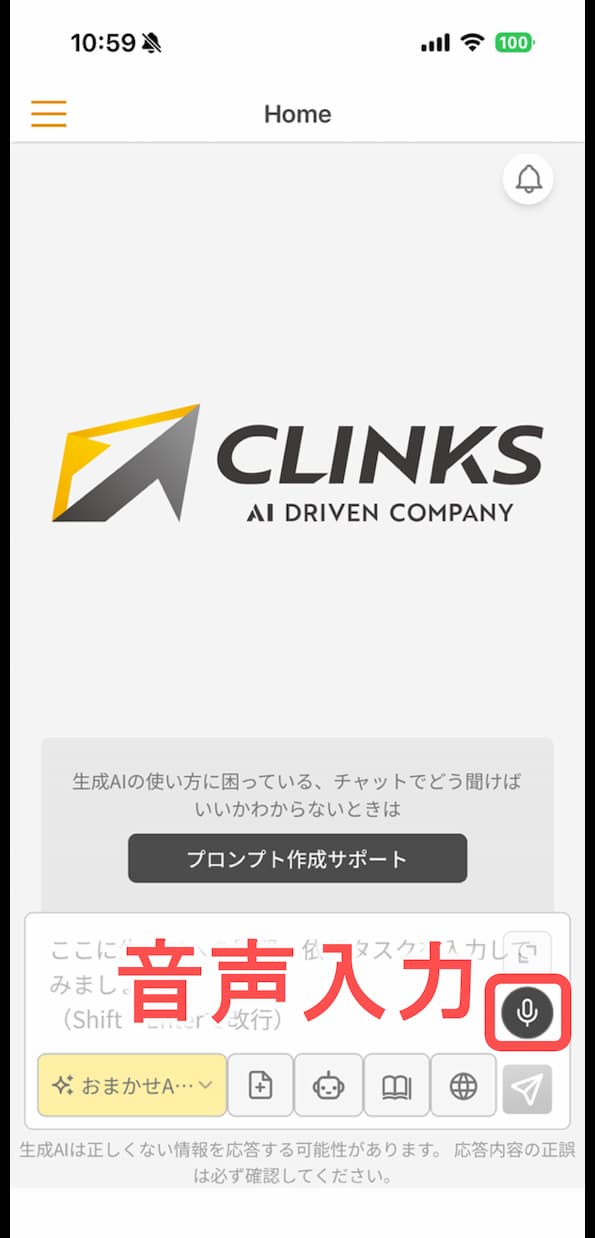 ボタンをタップして端末に話しかけるだけで、生成AIに送信するメッセージを入力できます。