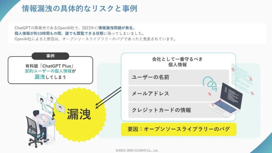 漏洩した情報にはユーザーの名前、メールアドレス、クレジットカードの情報が含まれていたとされています。OpenAI社は原因はオープンソースライブラリーのバグであったと発表していますが、有料版でも情報漏洩のリスクが存在することを示す事例となりました。