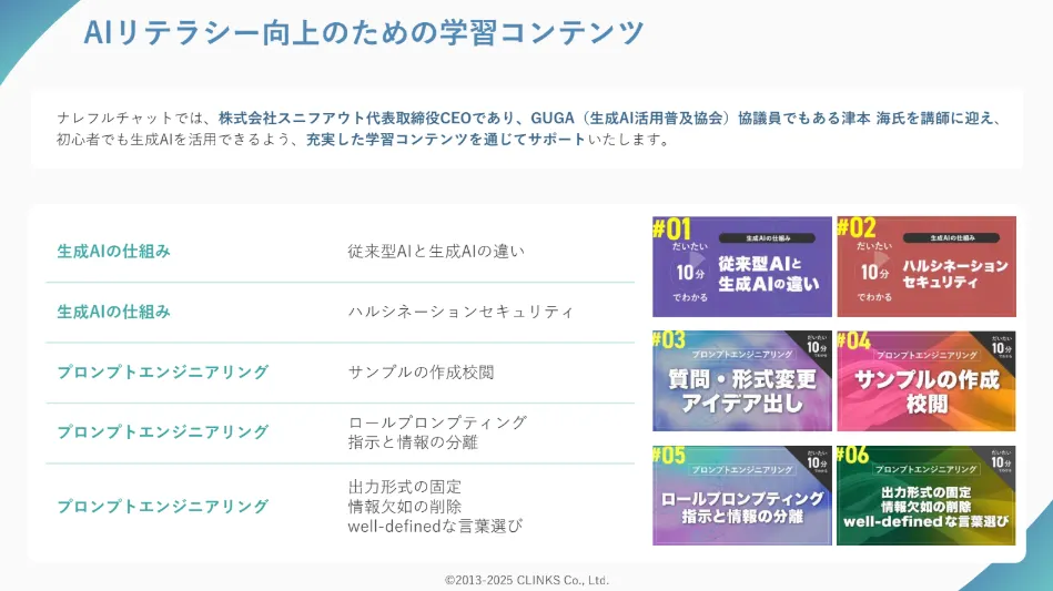ナレフルチャットでは、AIリテラシー向上支援のためのコンテンツを豊富に提供しています。