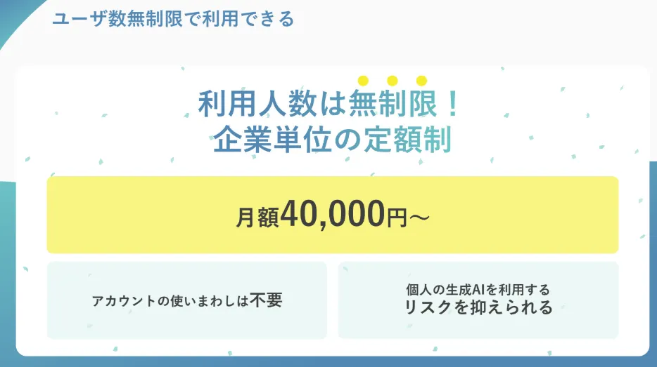 また、企業単位で月額4万円からの定額制のため、全従業員が個別アカウントを持つことが可能。そのため、アカウント共有による情報漏洩リスクも回避できます。