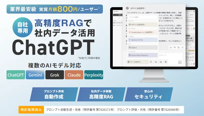 学習データに利用されないAPIを活用しているため、機密情報を入力しても学習データに一切使用されません。クローズドな環境で管理者がユーザーを制限でき、社内での情報共有も安全に行えます。