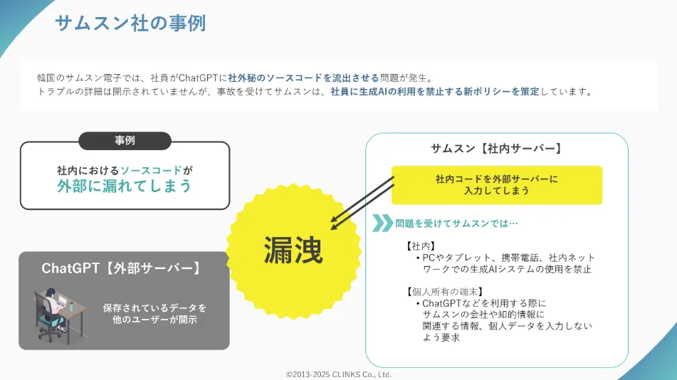 韓国のサムスン電子では、社員がChatGPTに社内機密のソースコードを入力する問題が発生しました。