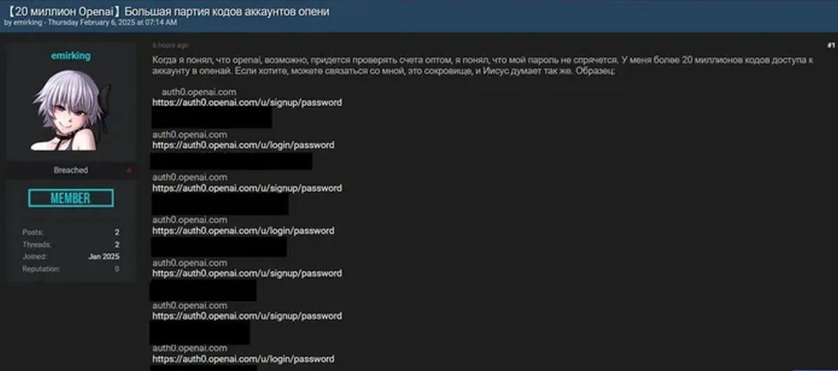セキュリティ企業Malwarebytesの調査によると、2025年2月に「emirking」というハンドルネームのサイバー犯罪者が、ダークウェブのフォーラムで2000万件を超えるOpenAIアカウントの認証情報を販売していることが判明しました。