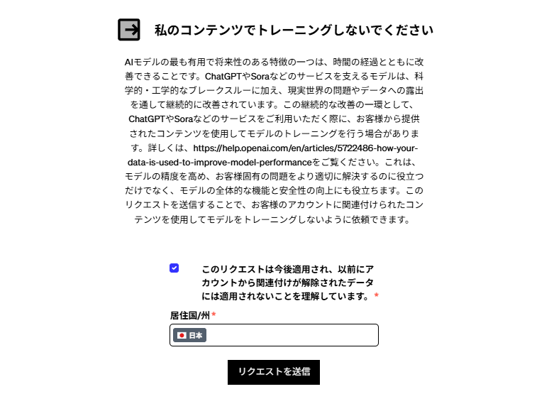 より確実にデータ学習を防ぎたい場合は、OpenAI Privacy Portalにある申請フォームから申請を行う方法が有効です。
