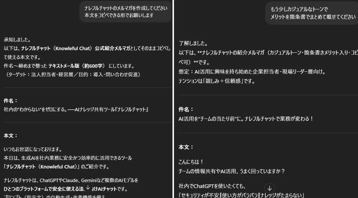ただし、これはやや複雑な作業になり、工夫も必要なため、慣れないうちは戸惑うかもしれません。そのような場合は、当社ナレフルチャットの活用をおすすめします。