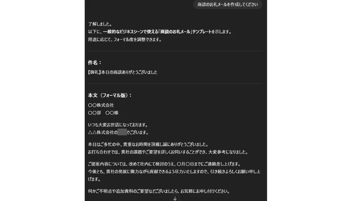ここでは、商談のお礼メールをChatGPTに作成してもらう、というケースを例にとっていきます。