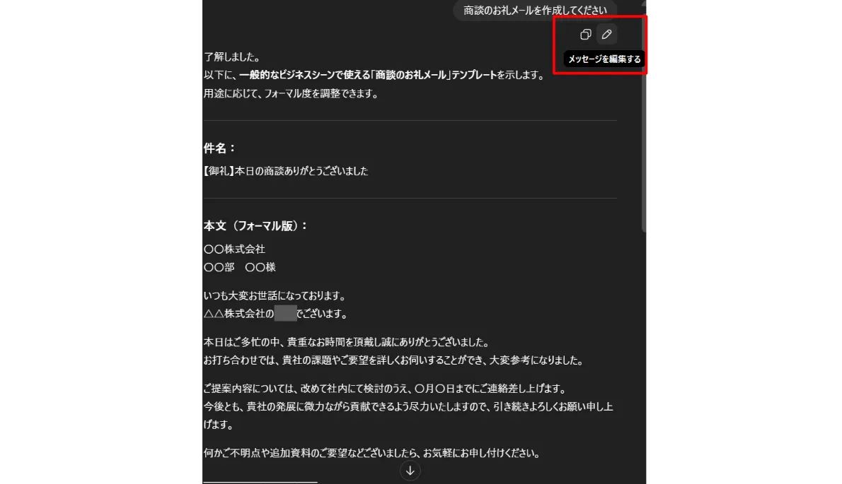回答が大きく期待外れだった場合は、プロンプト自体を見直す必要があります。ChatGPTなどの生成AIでは、送ったプロンプトを後から編集できる機能があります。この機能を活用し、元のプロンプトに加筆・修正しましょう。