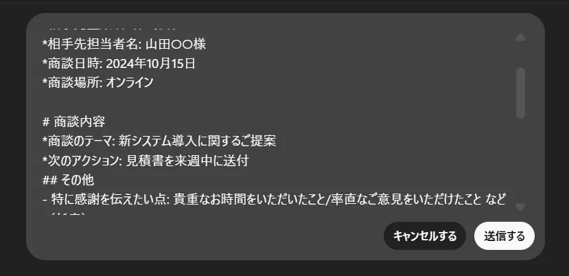 上記のように、詳細を入力した上で、右下の「送信する」を押すと、入力内容に即した出力が再度生成されます。