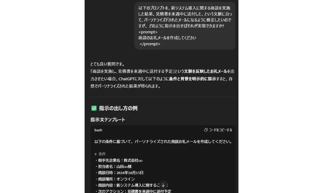このように、不足していた要素を補うことで、求める回答に近づけます。一度最適なプロンプトを作成すれば、テンプレートとして再利用できるため、長期的な効率化につながります。
