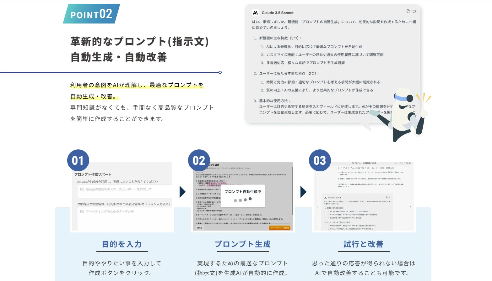 目的を入力するだけで最適なプロンプトが生成される上に、思った通りの結果が得られなければ、問題点を伝えるだけで自動的に改善案を提示してくれます。