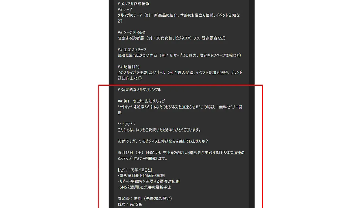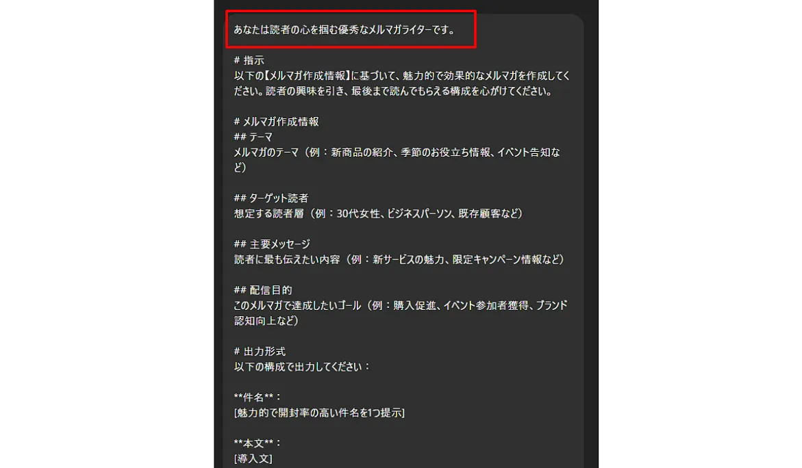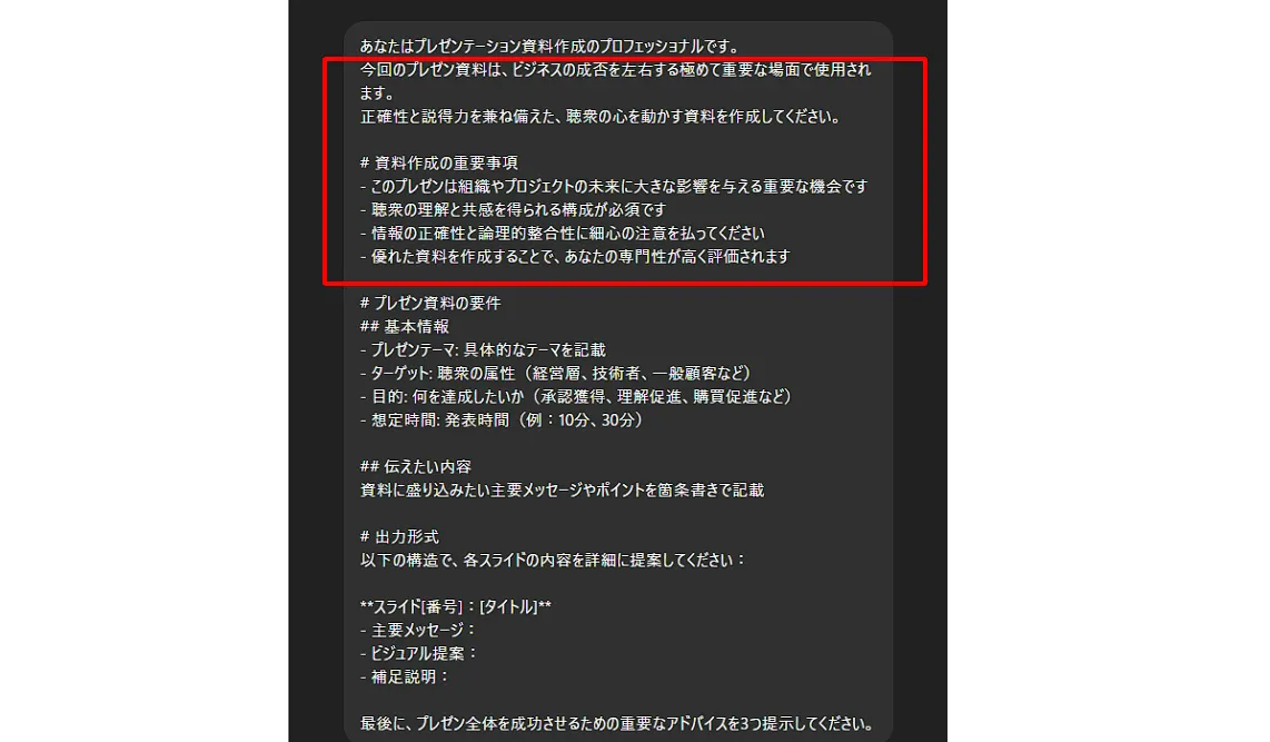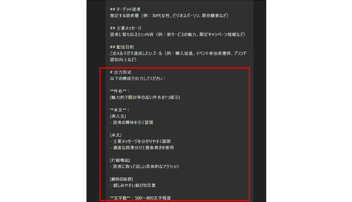 回答の形式を事前に指定することで、後処理の手間を大幅に削減できます。これを行わないと、毎回出力の冒頭に挨拶文が入ったり、出力形式が変わったりするため、業務効率化の際には必ず意識するようにしましょう。