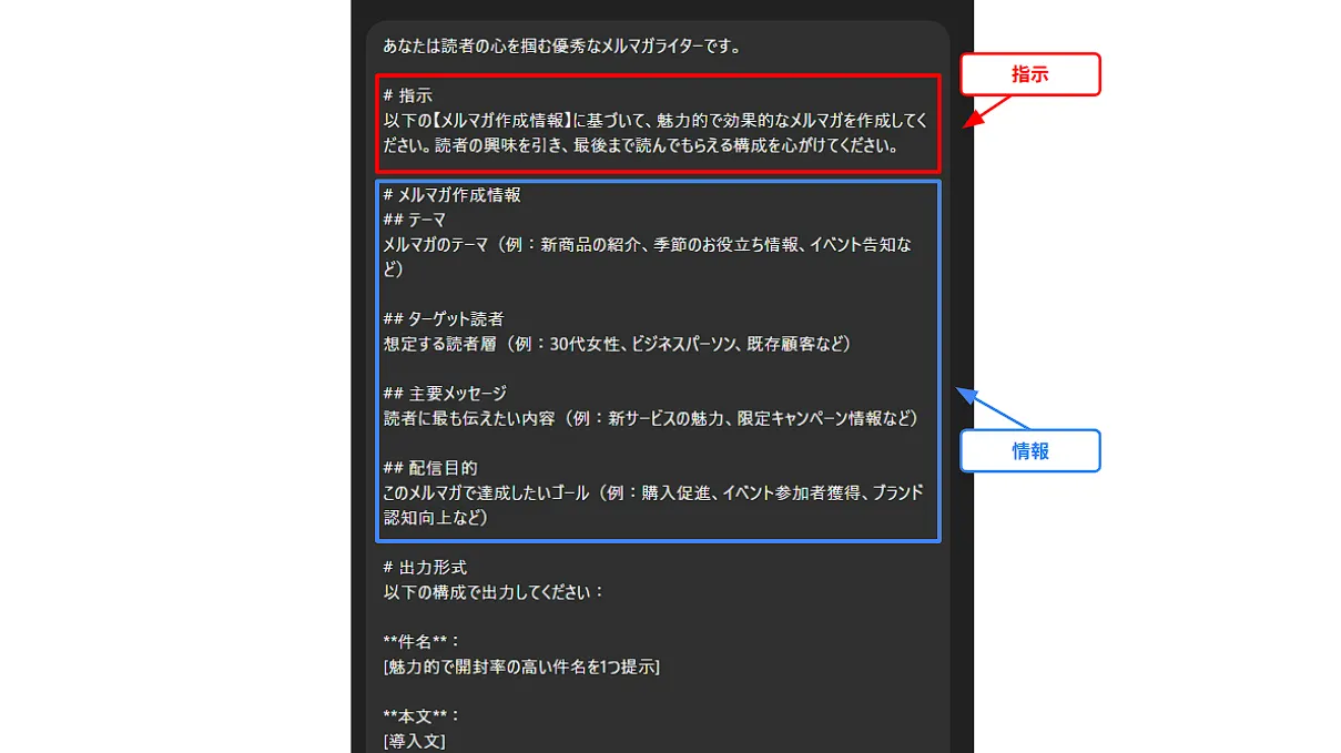さらに、このように構造化することで、この形式はテンプレートとして流用しやすくなるメリットもあります。同じタスクを繰り返す際に、情報部分だけを差し替えれば再利用できるのです。