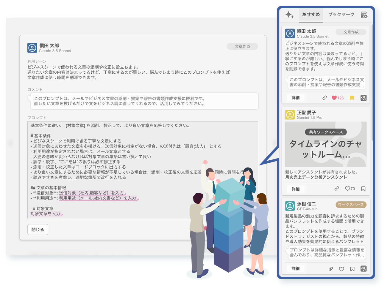 特許取得済みのプロンプト共有機能も大きな特徴です。チーム内で作成された効果的なプロンプトが、タイムラインに自動的に蓄積されます。高評価を得たプロンプトは組織全体で共有され、誰でもすぐに活用できる仕組みです。