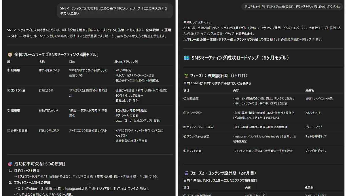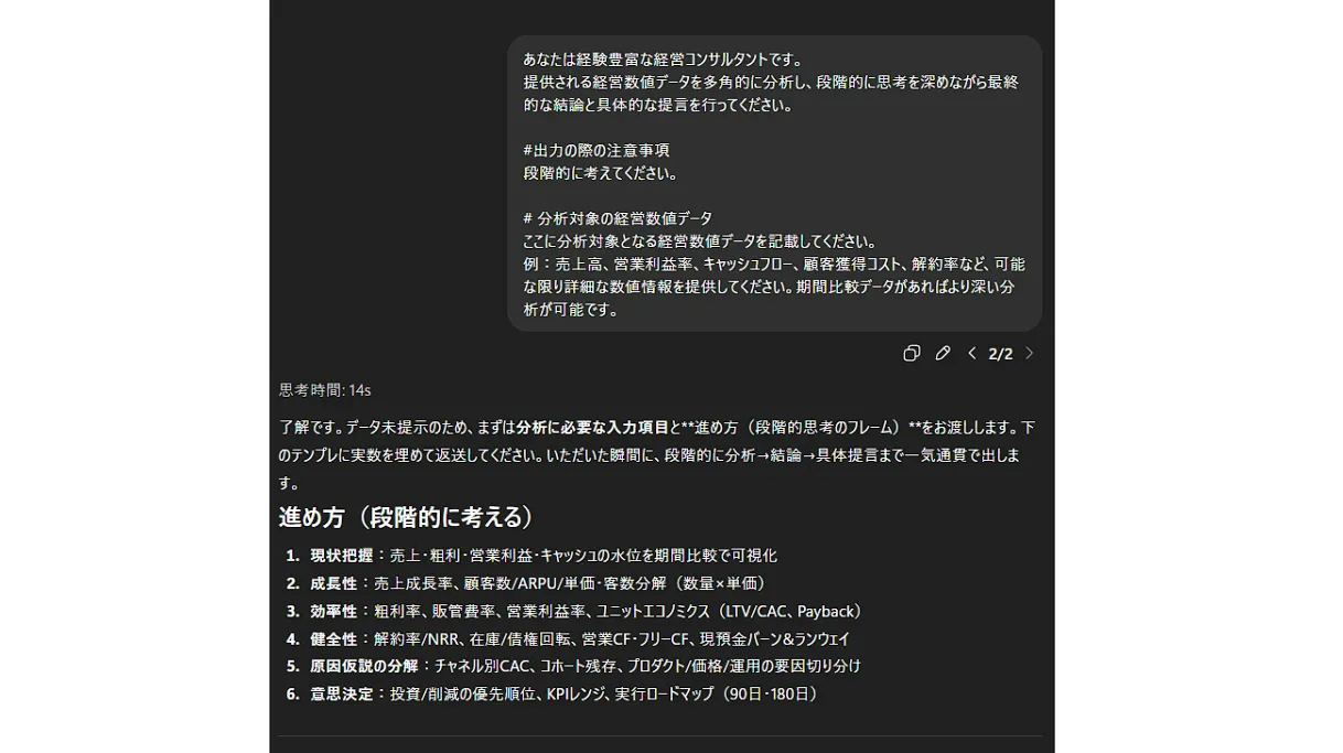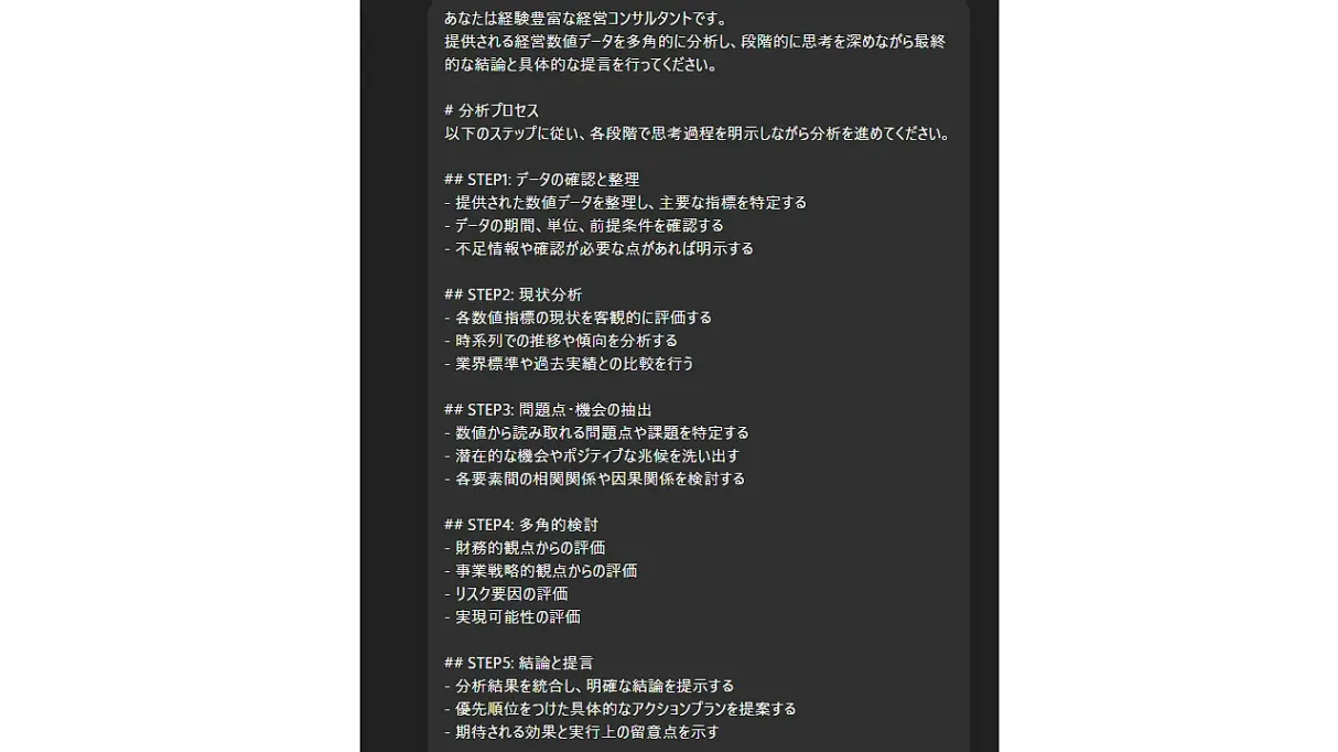 このように段階を踏むことで、ChatGPT内部から必要な知識を引き出し、より深い分析や提案が可能になります。特に専門的な判断や、複数の要素を統合した検討が必要な場合に効果的です。