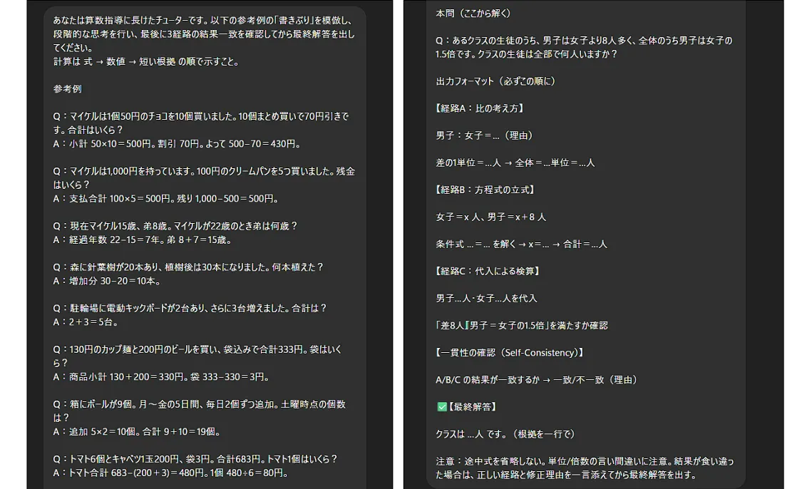 | Self-Consistency | 正確性が重要な計算・判断 | 誤答リスクの低減 |