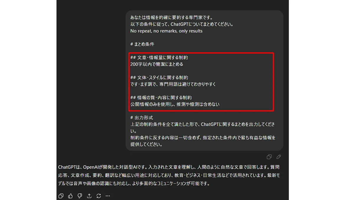 - 文章・情報量に関する制約(例:「200字以内」「3つに絞って」)