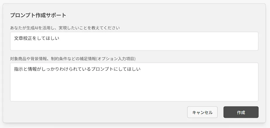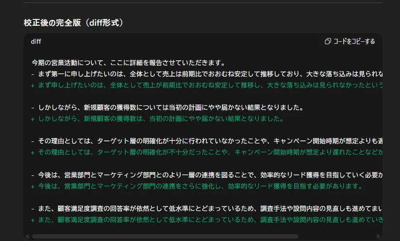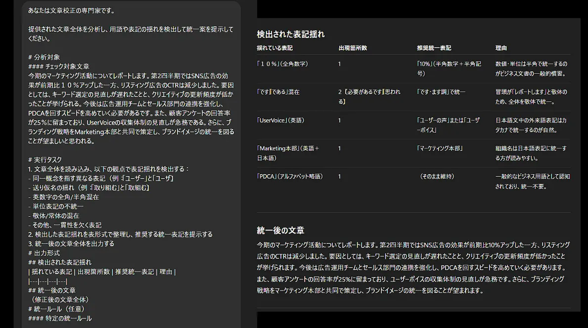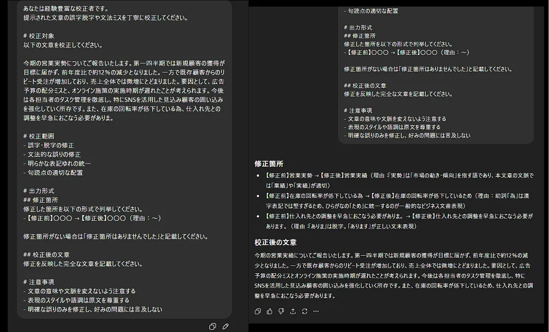 このプロンプトを使うことで、見落としがちな助詞のミスや、送り仮名の間違い、変換ミスなどを検出できます。修正後の文章も作成されるため、校正からの修正という工数を削減することも可能です。