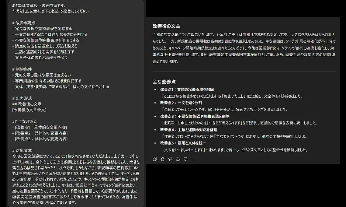 このプロンプトのポイントは「修正案は可能な限り元案と文字数を合わせること」という指示です。この指示がないと、ChatGPTは冗長な修正案を出力しがちのため、文字数制限を設けることで、簡潔で的確な修正案が得られます。