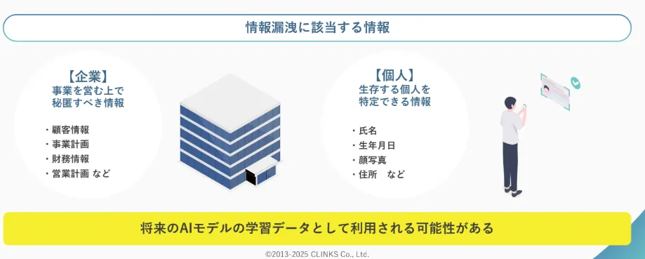 ChatGPTに機密情報を一切入力しないことは、最も基本的かつ重要なポイントです。ChatGPTに入力された情報は、生成AIの学習データとして利用される可能性があり、今後第三者にその情報が漏れてしまう恐れがあります。