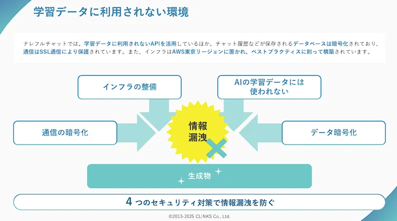 ナレフルチャットは入力内容が生成AIの学習データに利用されないAPIを活用している上に、データベースの暗号化や通信の保護まで行っており、企業での利用に適したセキュリティ対策を特徴としています。