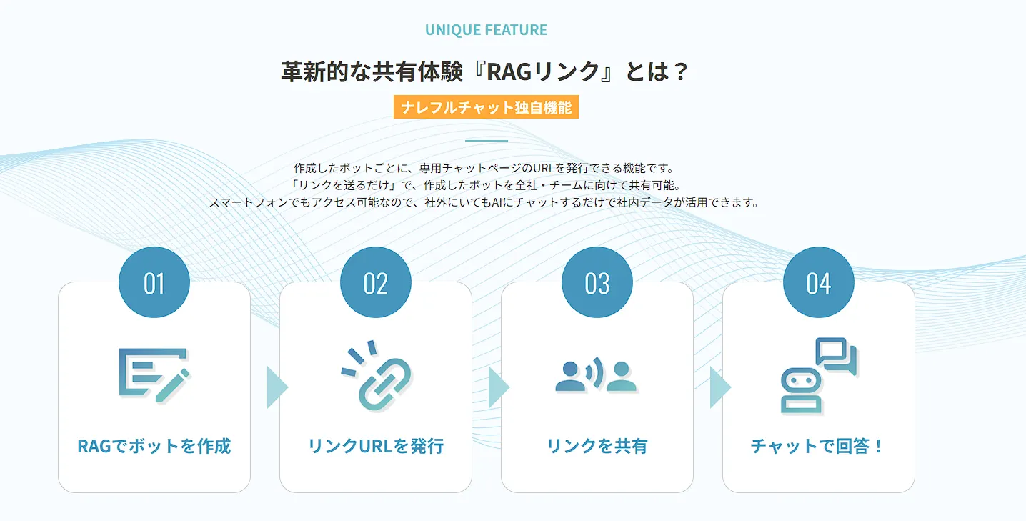 企業の文書には独自の表記ルールや用語集が存在することが多く、これらを反映した校正が求められることも多いでしょう。ナレフルチャットでは、PDFやWordなどのファイルをアップロードして読み込ませたチャットボットを作成し、それを全社・チームで共有できる『RAGリンク』機能も備えています。