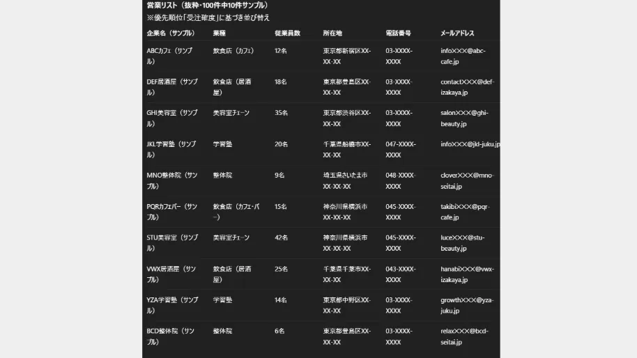 上記の設定と入力情報を基に、具体的な企業名を含む営業リストを作成します。各企業について、2cで指定した情報を提供し、優先順位に従ってリストを並べ替えます。