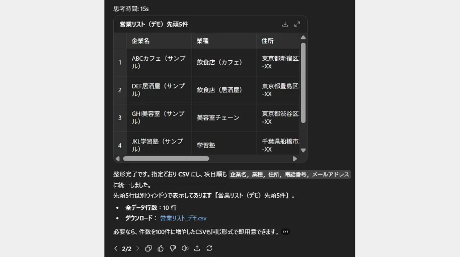 また、ChatGPTを活用すれば、情報の抜け漏れや表記ゆれが少ないリストを作成できます。手作業で発生しがちなミスを防ぎ、より信頼性の高い営業リストが完成するのです。