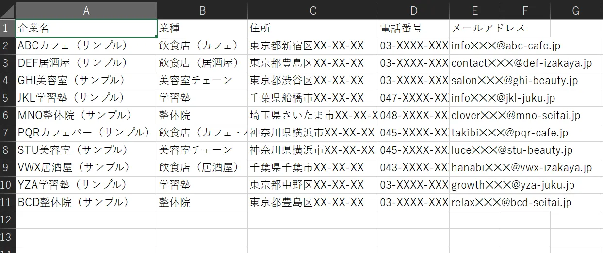上記の「営業リスト_デモ.csv」をダウンロードし、エクセルで開いたものが以下になります。