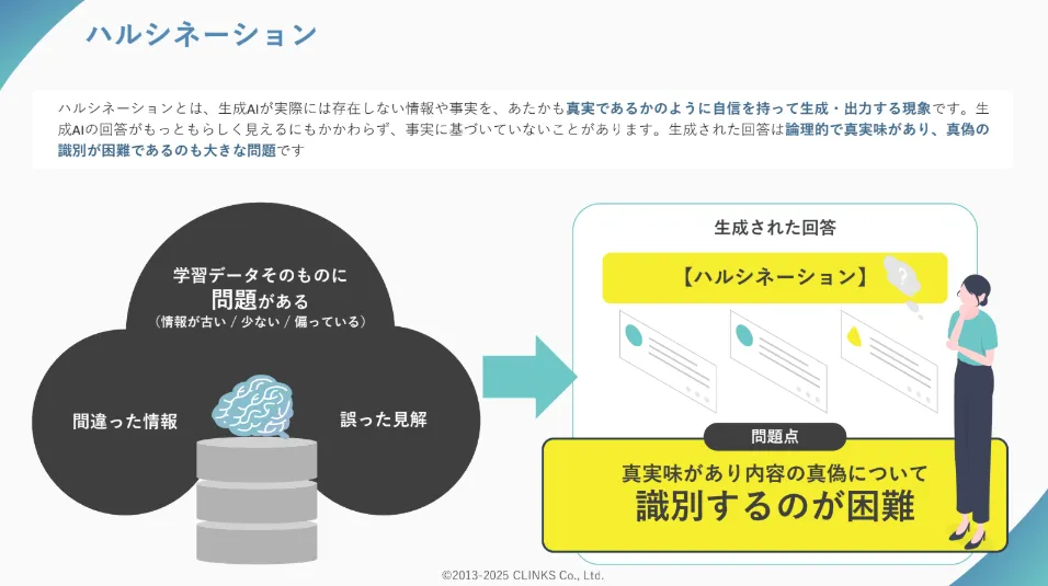 まず、ハルシネーション(AIが存在しない事実や誤った情報を「それらしく」生成する現象)の問題があります。