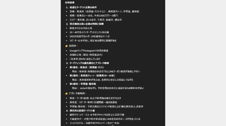 この分析結果は、効果的な営業リスト作成の基礎となり、受注確度の向上に貢献します。追加情報が必要な場合は、随時お聞きしますので、まずは上記の情報をご提供ください。
