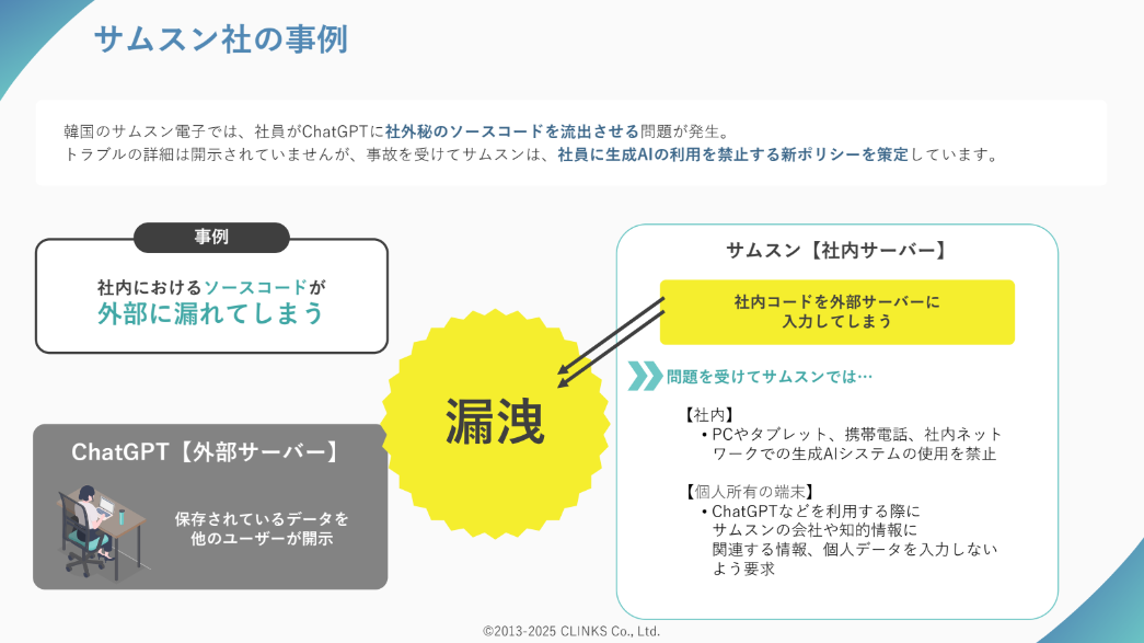 しかし、そうした顧客の個人情報や機密情報をChatGPTに入力することは、情報漏洩のリスクを伴います。実際に、2023年には韓国のサムスン電子で、社員が社外秘のソースコードをChatGPTに入力してしまい、機密情報の漏洩が発生する事例もありました。