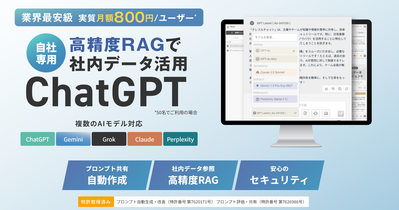 ナレフルチャットは、企業がクローズド環境でセキュアに利用できる対話型生成AIチャットツールです。法人向けに特化して開発されており、情報漏洩リスクを最小限に抑えながら、ChatGPTやGeminiなど複数のAIを活用することが出来ます。