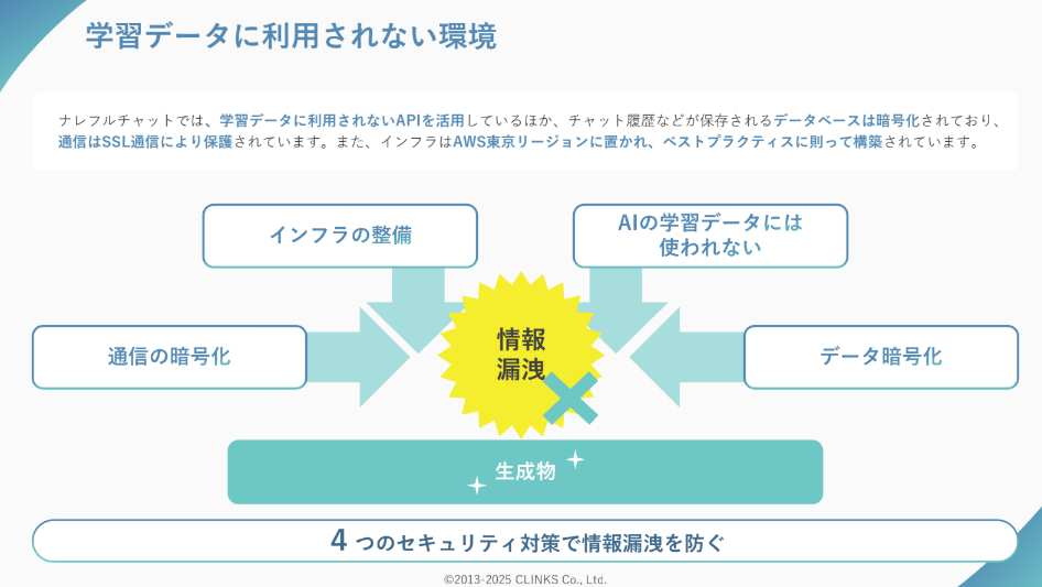 学習データに利用されない「API」を活用しているため、ナレフルチャットに入力した内容は学習データに一切利用されません。これにより、営業リスト作成時に自社の顧客情報や戦略的な情報を安心して活用できます。