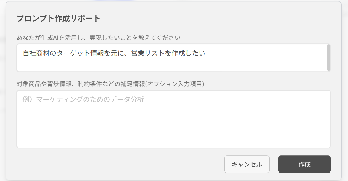 利用者の意図をAIが理解し、最適なプロンプトを自動生成・改善できる機能を搭載している点もナレフルチャットの大きな特徴です。営業リスト作成のような複雑なタスクでも、目的を入力するだけで適切なプロンプトが自動生成されます。