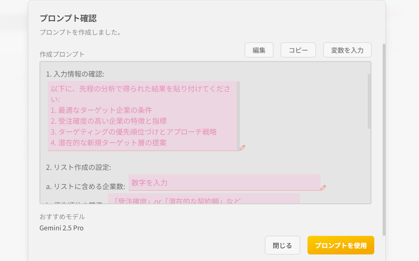 以下のプロンプト例を参考に、ターゲット設定を行ってください。