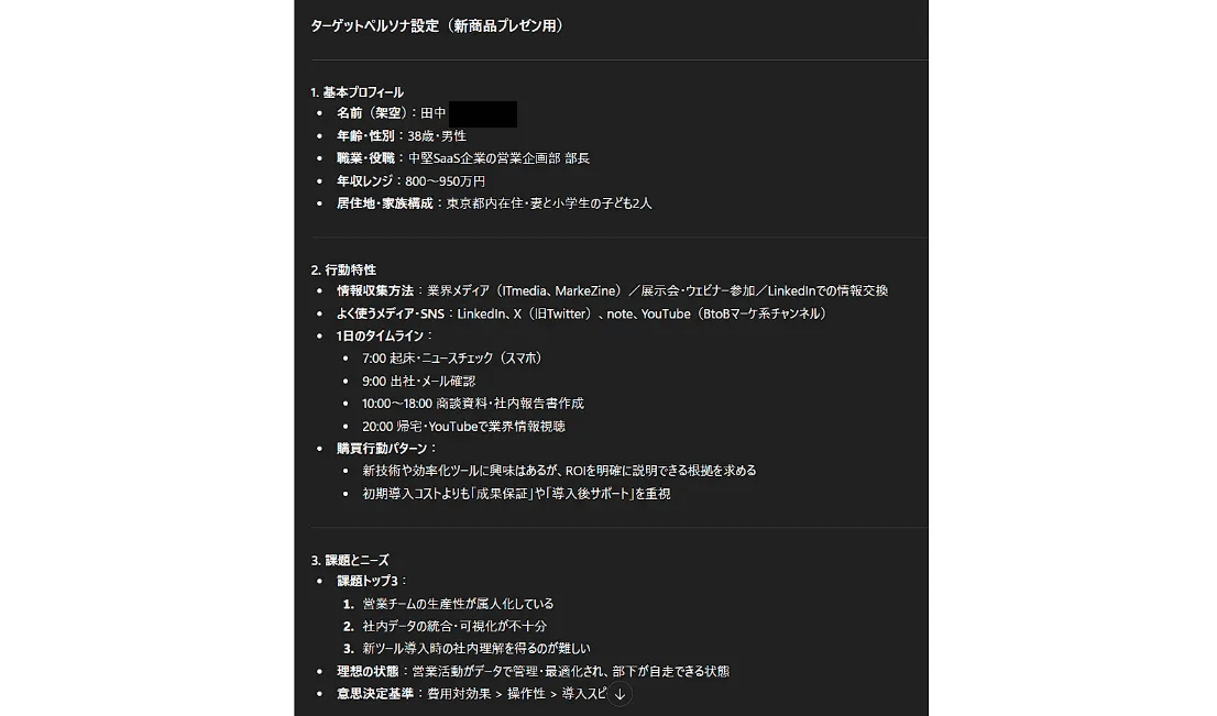 **資料を作る前に「誰に向けて作るのか」を明確にしておくと、内容の質が格段に上がります。**ChatGPTを使えば、業界特性や役職、課題感まで考慮したターゲットペルソナを短時間で設定できます。例えば、製造業向けなのか、IT業界向けなのかで、刺さる言葉やデータの種類も変わってくるため、この工程は省略しないことをおすすめします。