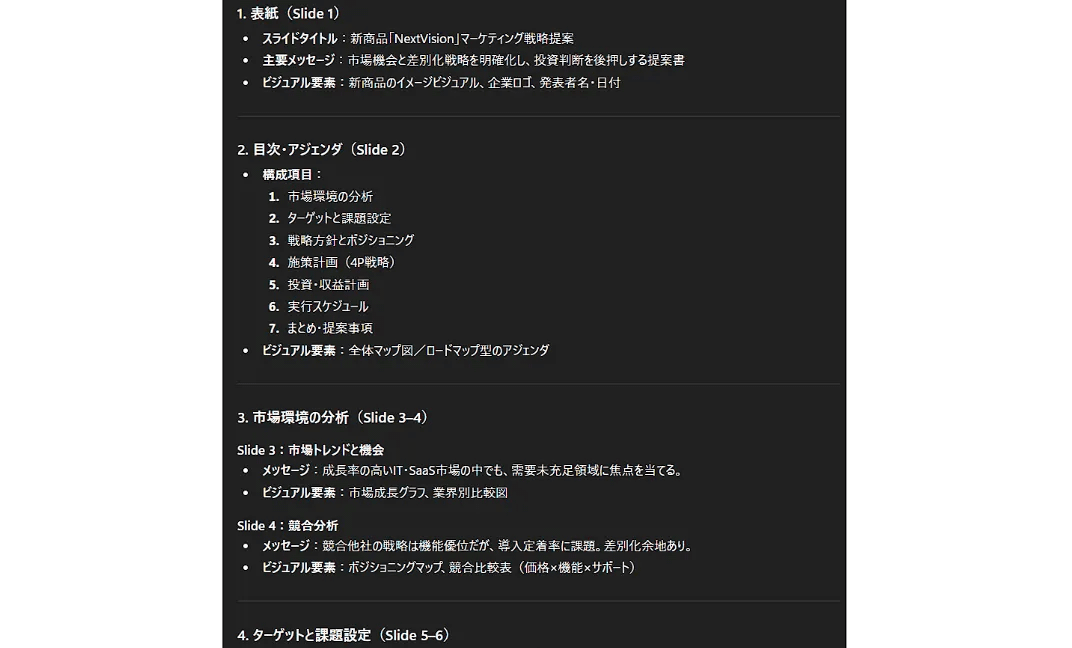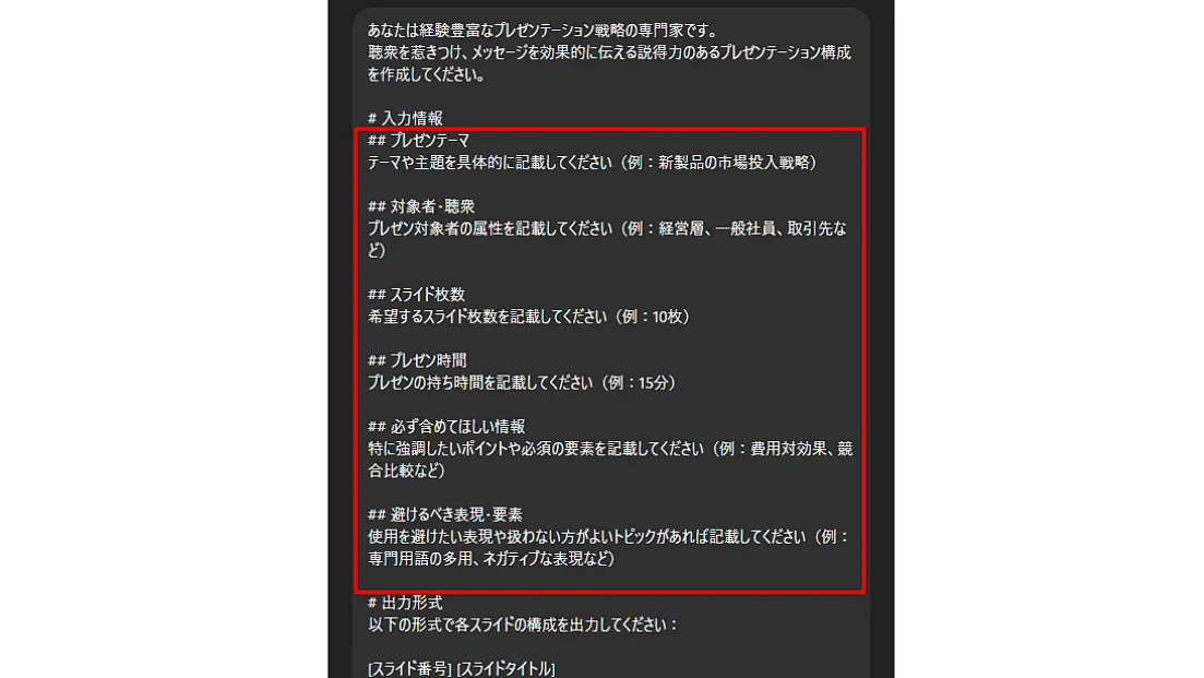 - あなたは企業向けプレゼン資料の作成に精通したコンサルタントです。