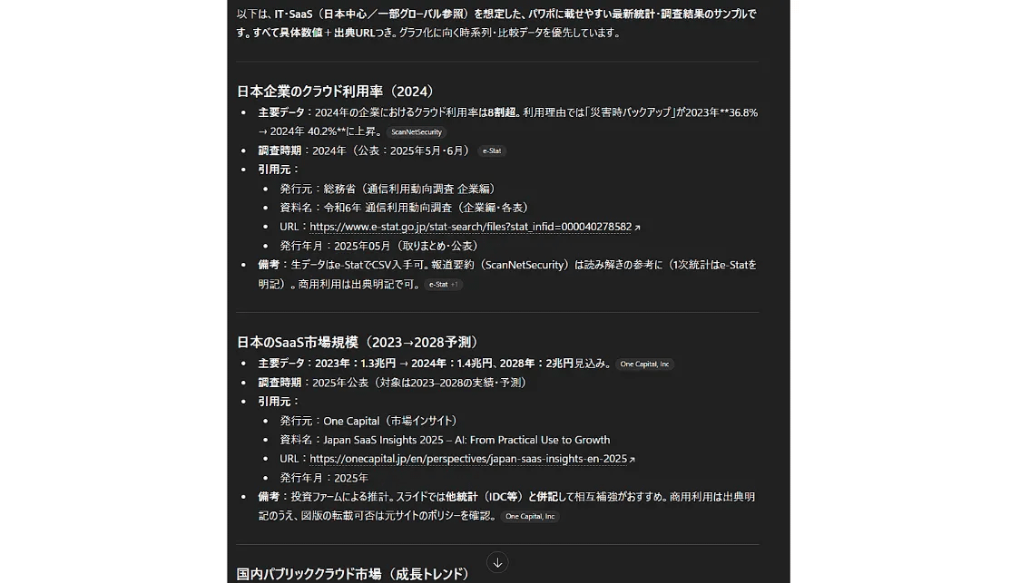 資料に説得力を持たせるには、客観的なデータが欠かせません。ChatGPTは業界統計や調査結果を提示してくれるだけでなく、引用元の情報も示してくれます。ただし、データの正確性は必ず自分で確認するようにしましょう。
