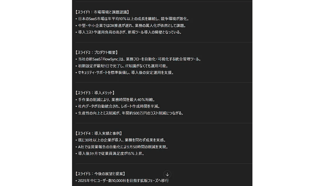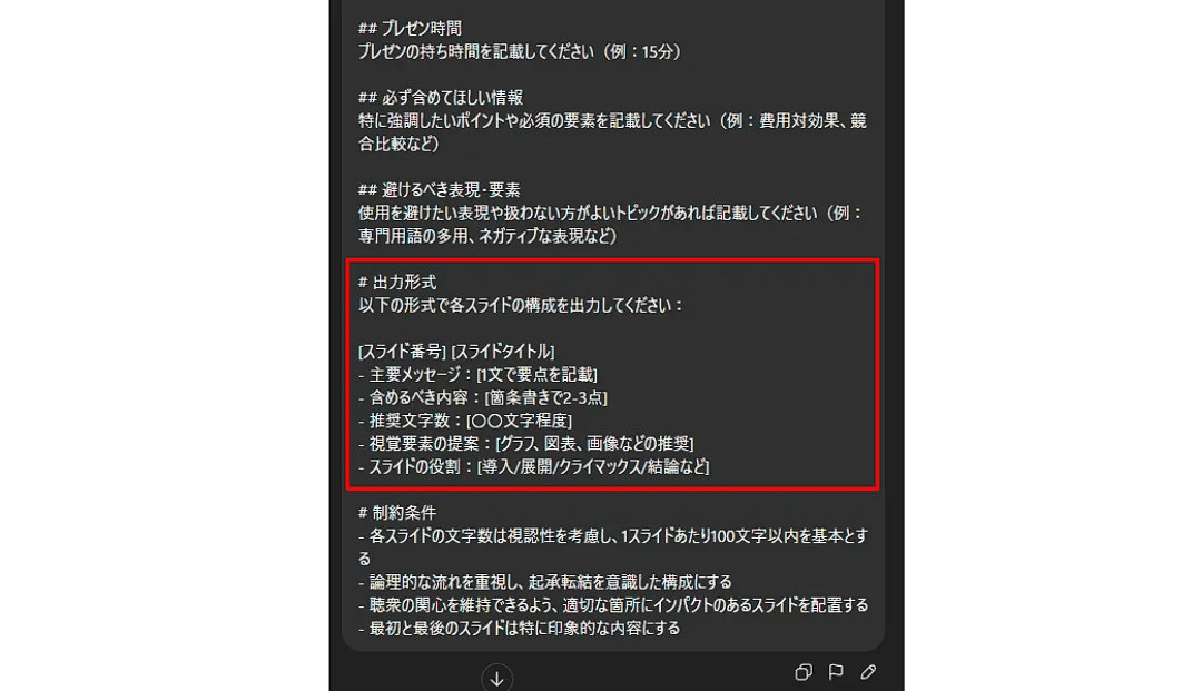 抽象的な指示では、期待と異なる出力になりがちです。スライド枚数、文字数、含めてほしい情報、避けるべき表現など、できるだけ詳細に条件を伝えることで、修正の手間を減らせます
