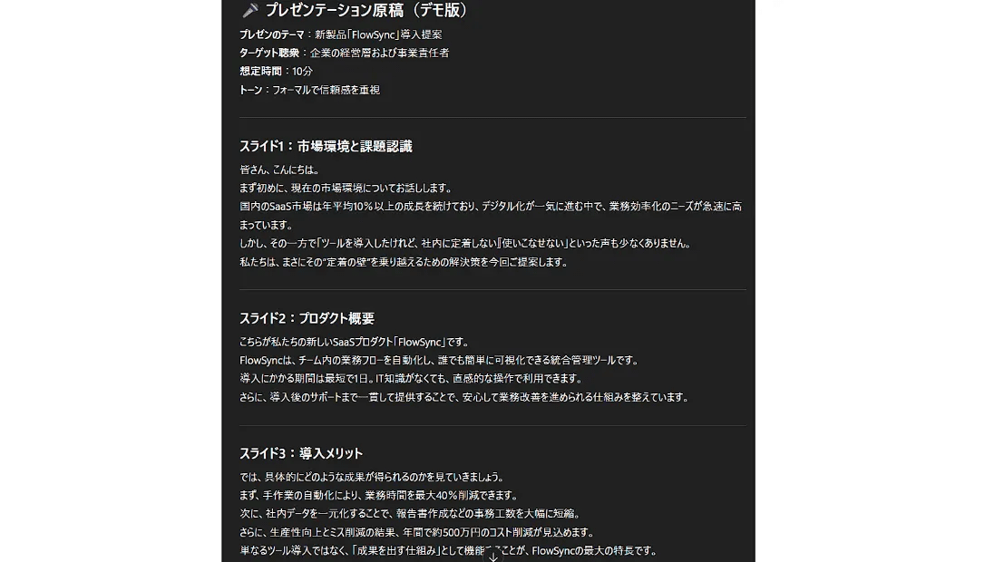 生成された原稿は、実際に声に出して読んでみることが大切です。書き言葉と話し言葉では印象が変わるため、読みにくい部分や不自然な表現は修正しましょう。また、プレゼンの相手や場面に応じて、敬語の度合いや専門用語の使用頻度も調整が必要です。
