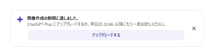 ChatGPTの無料プランでも画像生成機能は利用できますが、1日に生成できる枚数には上限があり、おおむね3枚程度までとされています。生成回数は一定時間後(目安として24時間程度)にリセットされるため、時間を置けば再び利用可能です。