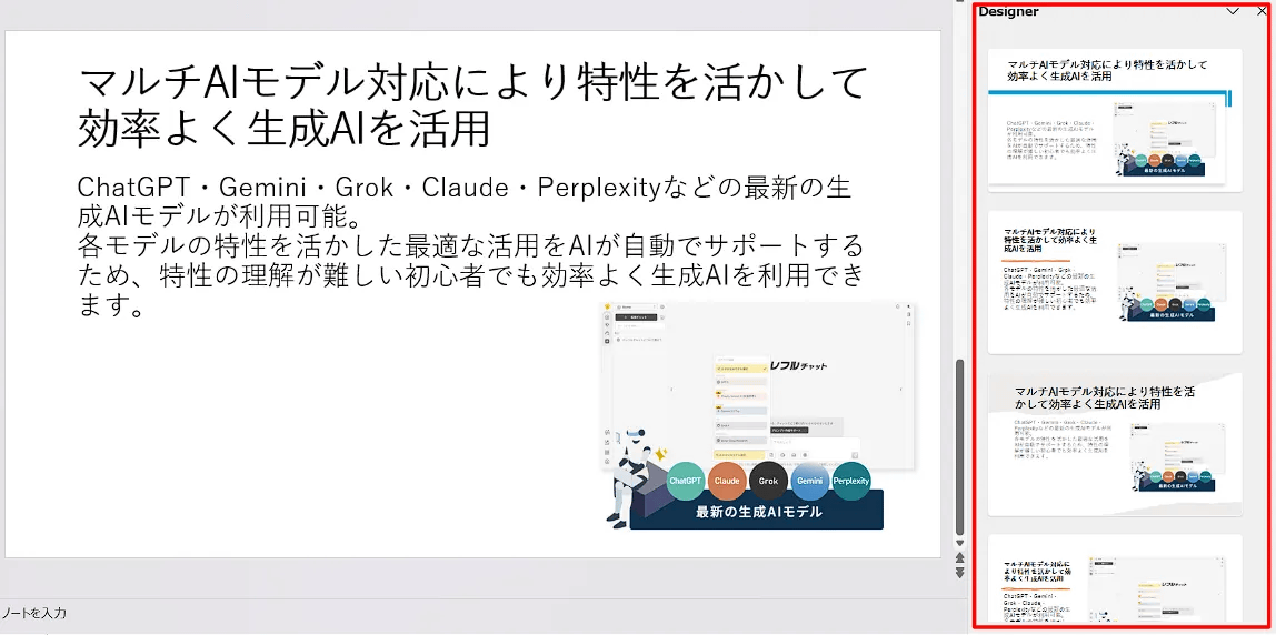 ChatGPTと並行して活用したいのが、PowerPointに搭載されているDesigner機能です。スライドに画像やテキストを配置すると、自動的に複数のデザイン案を提案してくれます。デザインの知識がなくても、プロフェッショナルな見た目の資料を短時間で作成できる便利な機能です。