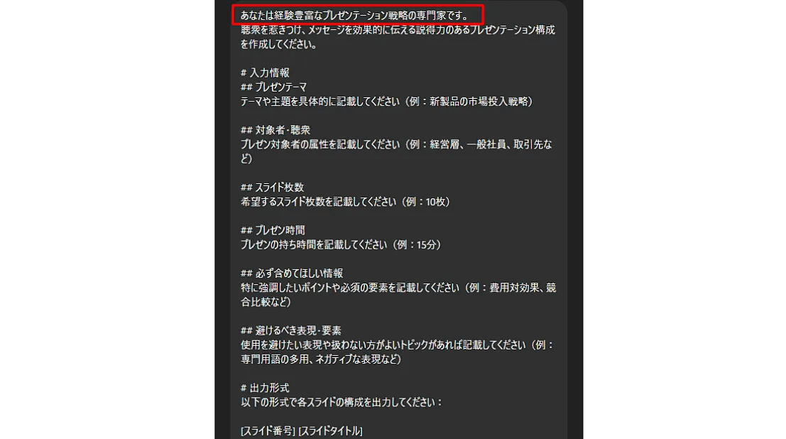 これは、ロールプロンプティングというテクニックで、AIに特定の立場や専門性があると指示することで、より専門的な内容の出力を引き出せます
