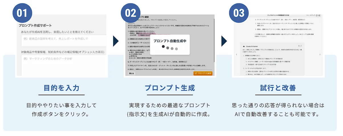 ナレフルチャットには、プロンプトを自動で作成・改善する機能が搭載されています。やりたいことを簡単な言葉で伝えるだけで、AIが最適なプロンプトを生成してくれるため、プロンプト作成に慣れていない方でも高品質な出力を得られます。