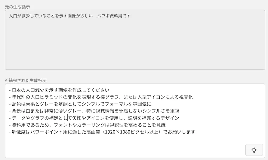 また、スライド資料にそのまま使える画像の作成についても、それに特化したプロンプトをAIが補完してくれます。