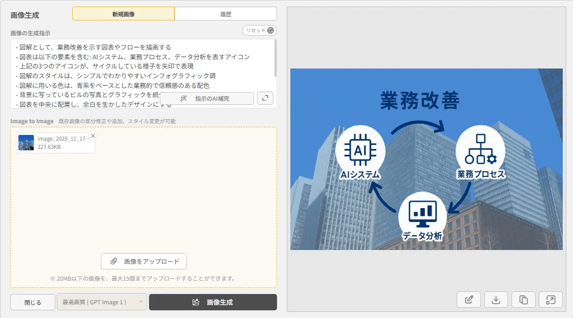元画像はビルと青空が映ったフリー画像でしたが、Image to Image機能と、上述の指示の補完機能で生成されたプロンプトによって、SaaSの資料に使えそうな画像に作成することができました。